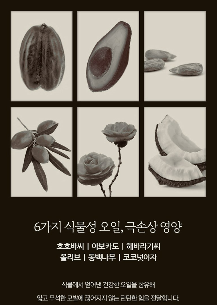 호호바씨, 아보카도, 해바라기씨, 올리브, 동백나무, 코코넛야자 등 식물에서 얻어난 건강한 오일을 함유해 얇고 푸석한 모발에 끊어지지 않는 탄탄한 힘을 전달해요.