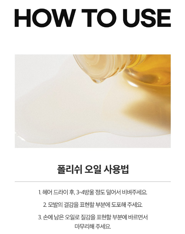 가볍게 발리는 오일 제형이라 폴리쉬 헤어 오일을 처음 사용해보시는 분들도 부담없이 사용할 수 있어서 좋아요.