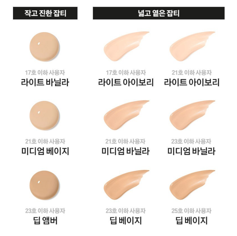 작고 진한 잡티는 블랙 컨실러 닷 커버를 사용하시면 좋아요. 17호 이하 사용자는 라이트 바닐라, 21호 이하는 미디엄 베이지, 23호 이하는 딥 엠버 사용하시면 될 것 같구요, 넓고 옅은 잡티는 스프레드 커버 사용하시면 되며, 17호,21호 이하 사용자는 라이트 아이보리, 21호, 23호 이하는 미디엄 바닐라, 23호, 25호 이하 사용자는 딥 베이지 사용하시면 될 것 같아요!