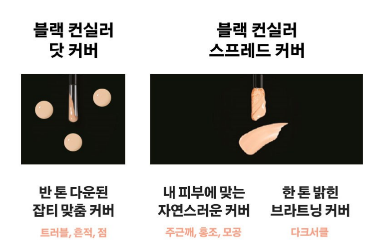 블랙 컨실러 닷 커버는 반 톤 다운된 잡티 커버 맞춤 쉐이드예요. 트러블, 흔적, 점 커버 등에 유용해요. 또, 블랙 컨실러 스프레드 커버는 내 피부에 맞는 자연스러운 커버로 주근깨, 홍조, 모공 커버 등에 유용하고, 한 톤 밝힌 브라트닝 커버로 다크서클 커버에도 유용하답니다.