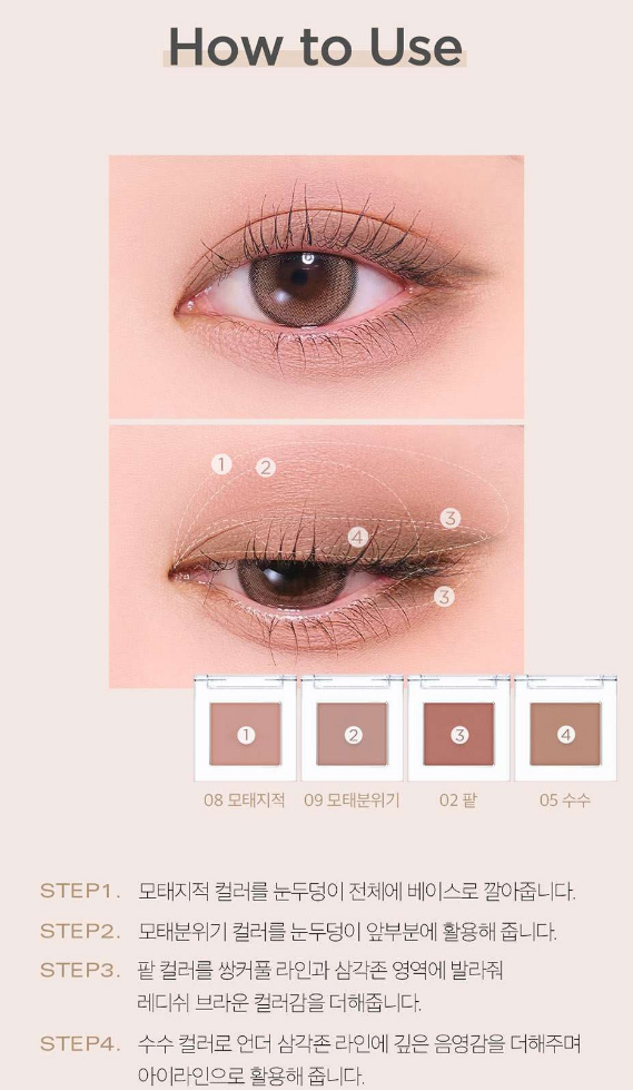 모태지적 컬러를 눈두덩이 전체에 베이스로 깔아주세요. 그 다음 모태 분위기 컬러를 눈두덩이 앞부분에 활용해 주세요. 다음으로 팥 컬러를 쌍커풀 라인과 삼각존 영역에 발라주세요. 마지막으로 수수컬러로 언더 삼각존 라인에 깊은 음영감을 더해주며 아이라인으로 활용해주세요.