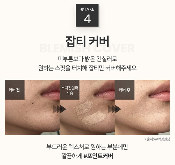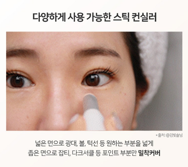 스틱 컨실러로 한 번 터치해주시고, 손가락보다는 브러쉬나 퍼프로 경계를 없애주시면 지저분한 자국 없이 더욱 매끄럽게 커버하실 수 있어요!