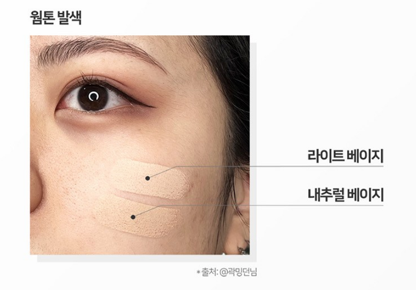 라이트 베이지와 내추럴 베이지를 웜톤 피부에 발색한 사진이에요.