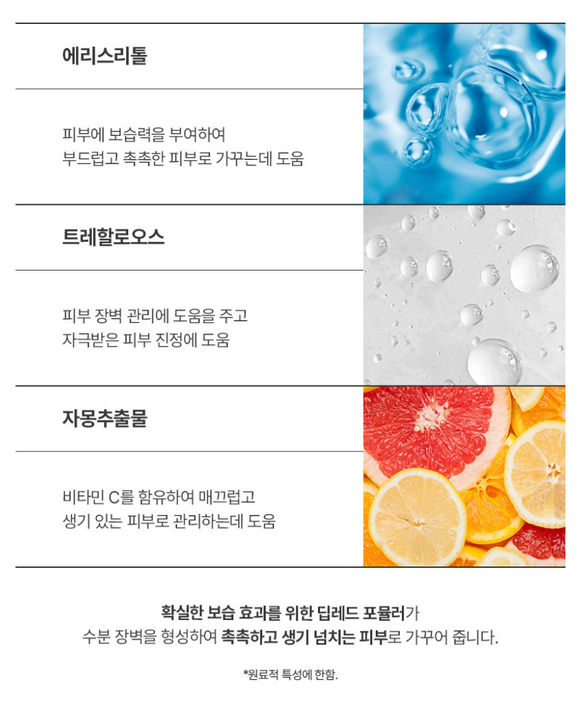 에리스리톨, 트레할로오스, 자몽추출물 등 확실한 보습 효과를 위한 딥레드 포뮬러가 수분 장벽을 형성하여 촉촉하고 생기 넘치는 피부로 가꾸어 줘요.