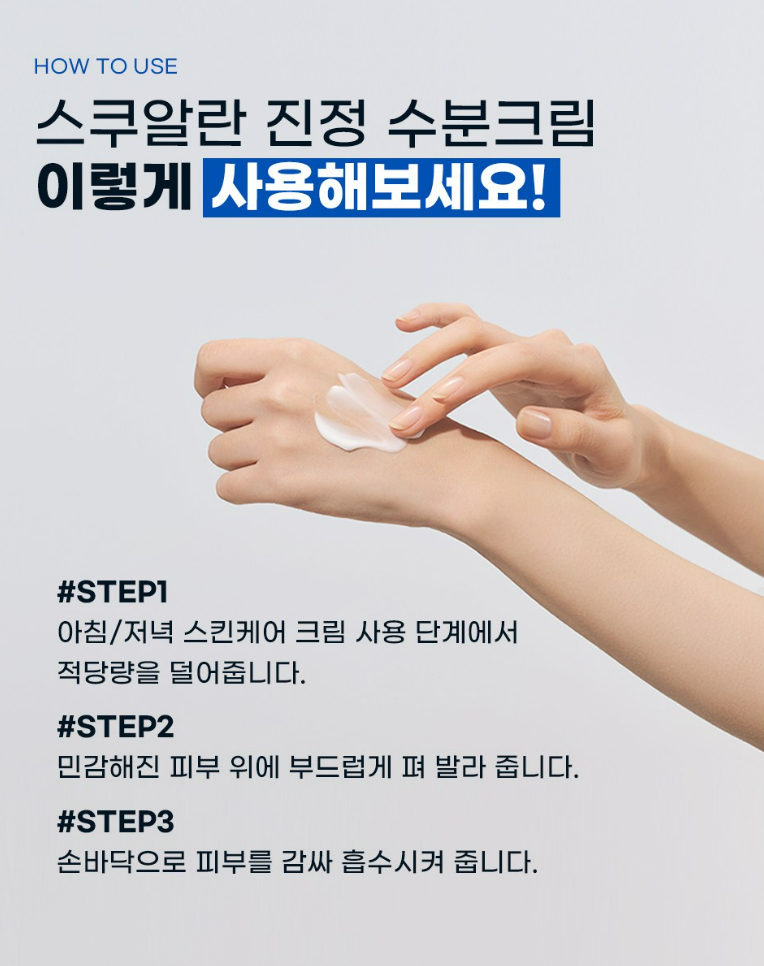아침, 저녁 스킨케어 크림 사용 단계에서 적당량을 덜어주세요. 민감해진 피부 위에 부드럽게 펴 발라주고 손바닥으로 피부를 감싸 흡수시켜 주세요.