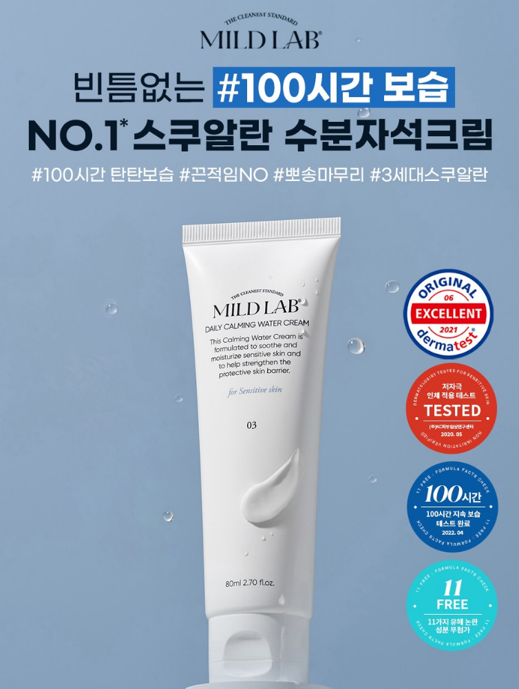 마일드랩 수분크림은 민감성 패널, 피부과 저자극 인체 적용 테스트를 완료한 제품이며, 11가지 유해 논란 성분이 무첨가된 제품이에요. 민감성 피부도 안심하고 사용할 수 있는 저자극 제품이에요.