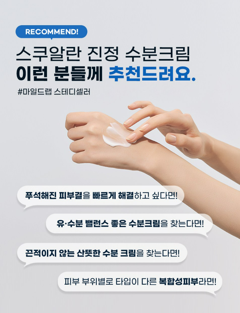 푸석해진 피부결을 빠르게 해결하고 싶으신 분, 유/수분 밸런스 좋은 수분크림을 찾으시는 분, 끈적이지 않는 산뜻한 수분크림을 찾으시는 분, 피부 부위별로 타입이 다른 복합성 피부이신 분들께 마일드랩 수분크림을 추천드려요.