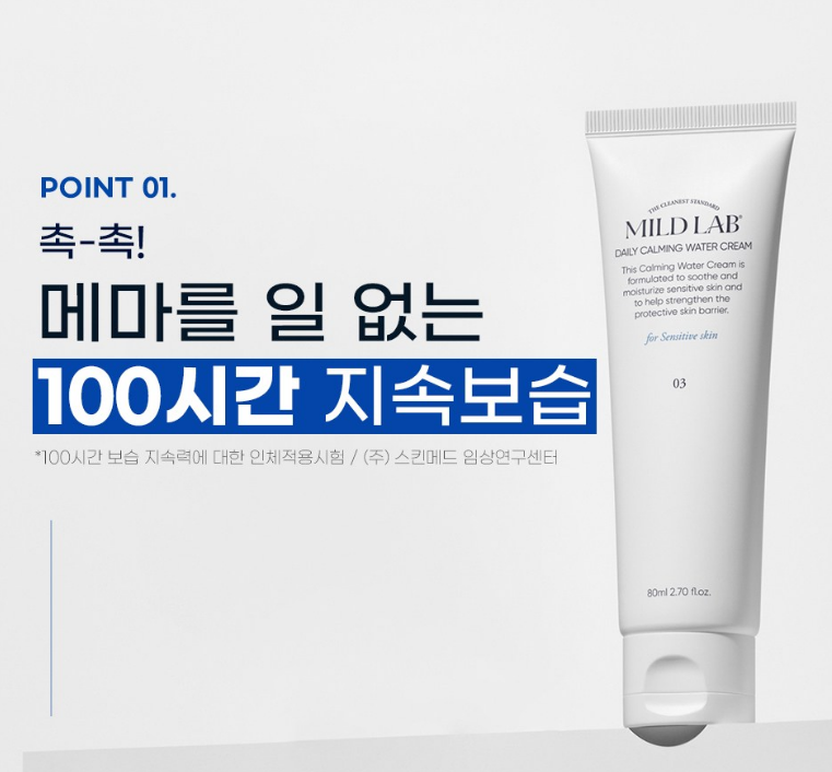 마일드랩 진정 수분크림은 메마를 일 없이 100시간 동안 피부의 보습을 지속시켜주는 제품이에요.