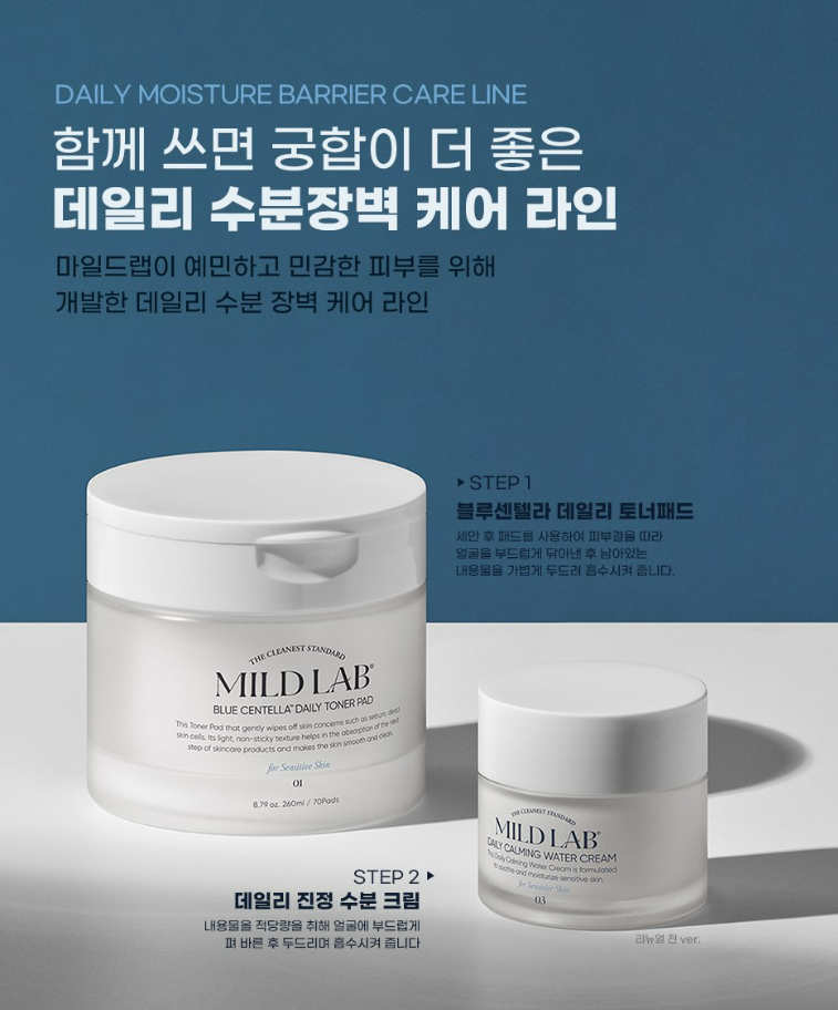 마일드랩의 블루센텔라 데일리 토너패드와 수분크림을 함께 사용해보세요. 함께 쓰면 궁합이 더 좋고 데일리 수분 장벽 케어를 간편하게 할 수 있어요.