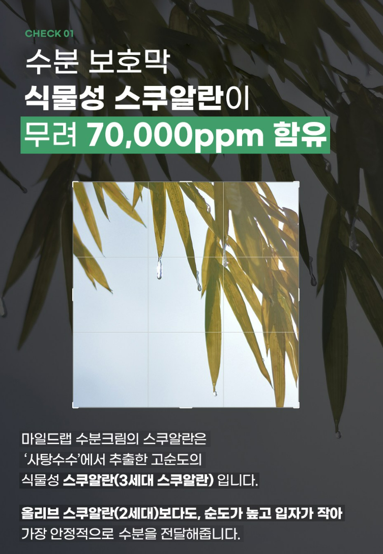 마일드랩 수분크림의 스쿠알란은 사탕수수에서 추출한 고순도의 식물성 스쿠알란이에요. 올리브 스쿠알란 보다도 순도가 높고 입자가 작아 가장 안정적으로 수분을 전달해줘요.