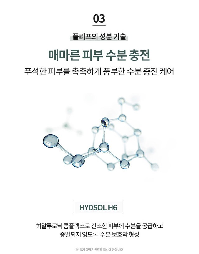 히알루로닉 콤플렉스로 건조한 피부에 수분을 공급하고 증발되지 않도록 수분 보호막을 형성해요.