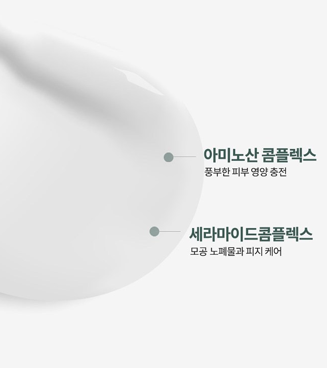 피부 수분 뿐만 아니라 풍부한 피부 영양 충전에 도움을 주는 아미노산 콤플렉스와, 모공 노폐물과 피지를 케어해주는 세라마이드 콤플렉스가 함유되어 있어요.