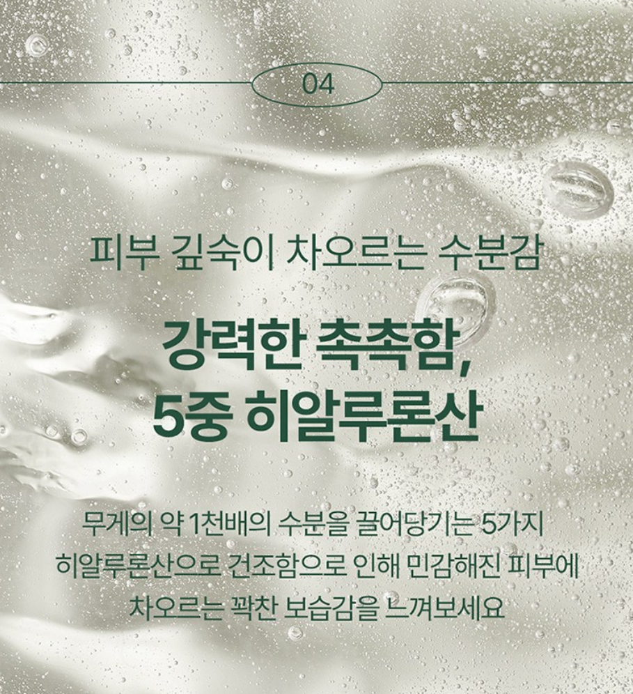 무게의 약 1천배의 수분을 끌어당기는 5가지 히알루론산으로 건조함으로 인해 민감해진 피부에 차오르는 꽉찬 보습감을 느낄 수 있어요.