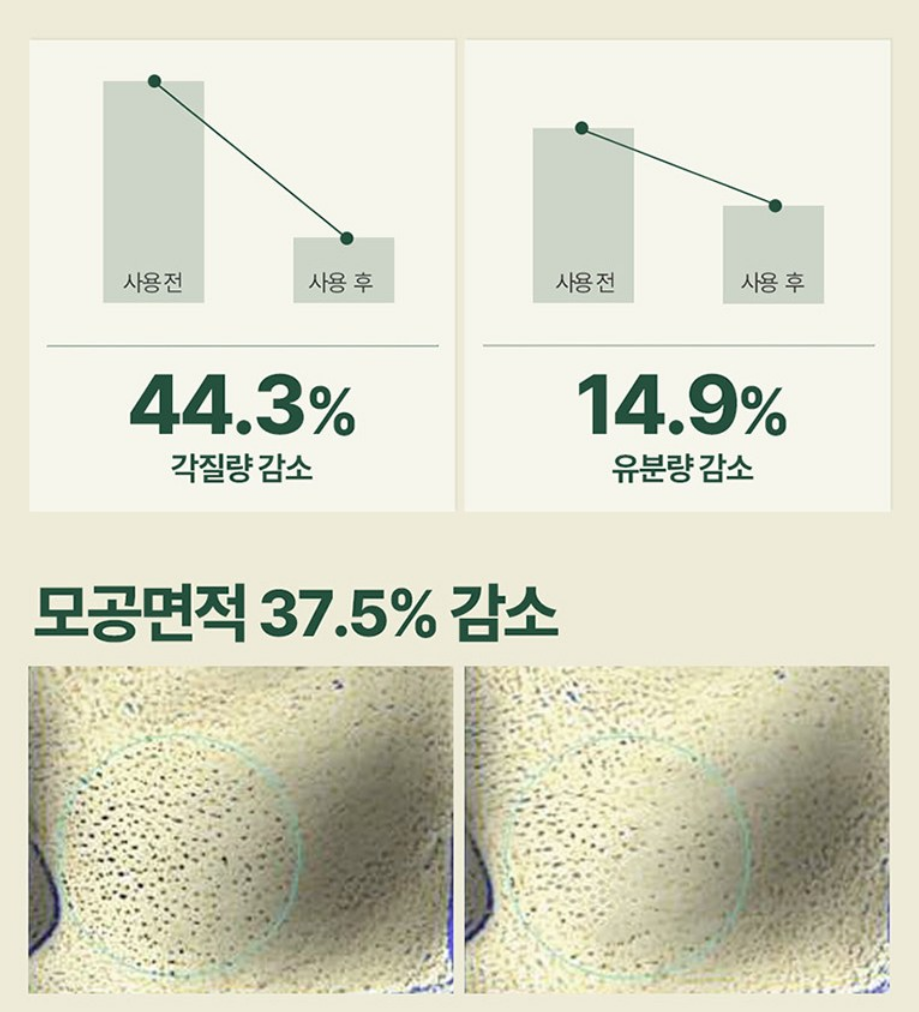 편강율 진정 수분 크림 사용 후, 각질량, 유분량, 모공 면적이 감소하는 효과를 볼 수 있어요.
