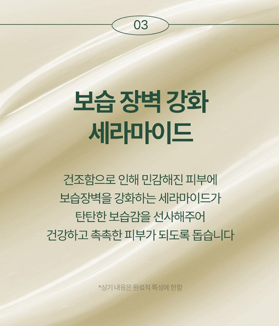 건조함으로 인해 민감해진 피부에 보습 장벽을 강화하는 세라마이드가 탄탄한 보습감을 선사해주어 건강하고 촉촉한 피부가 되도록 도와줘요.