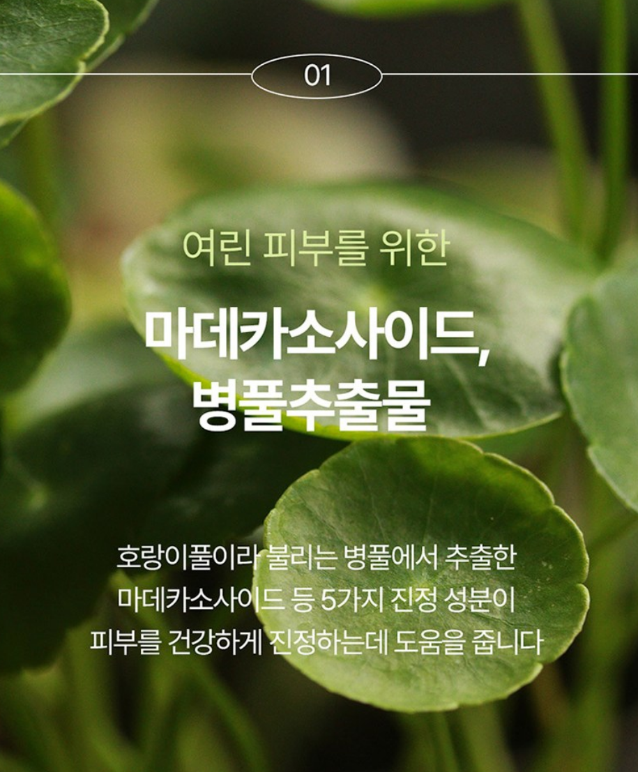 편강율 진정 수분 크림은 호랑이풀이라 불리는 병풀에서 추출한 마데카소사이드 등 5가지 진정성분이 피부를 건강하게 진정하는데 도움을 줘요.