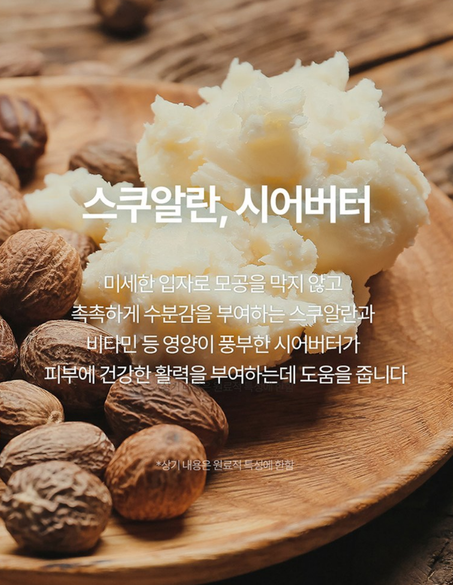 미세한 입자로 모공을 막지 않고 촉촉하게 수분감을 부여하는 스쿠알란과 비타민 등 영양이 풍부한 시어버터가 피부에 건강한 활력을 부여하는데 도움을 줘요.