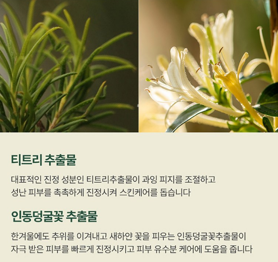 대표적인 진정 성분인 티트리 추출물이 과잉 피지를 조절하고 성난 피부를 촉촉하게 진정시켜줘요. 또한 한겨울에도 추위를 이겨내고 새하얀 꽃을 피우는 인동덩굴꽃추출물이 자극 받은 피부를 빠르게 진정시키고 피부 유수분 케어에 도움을 줘요.