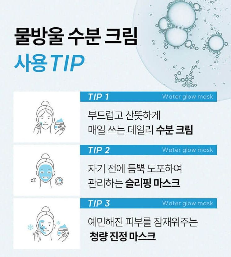 물방을 수분 클렌징폼, 토너, 앰플, 크림을 단계 별로 사용하여 수분을 레이어링 해주시면 더욱 좋아요.