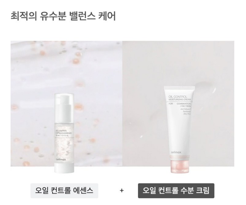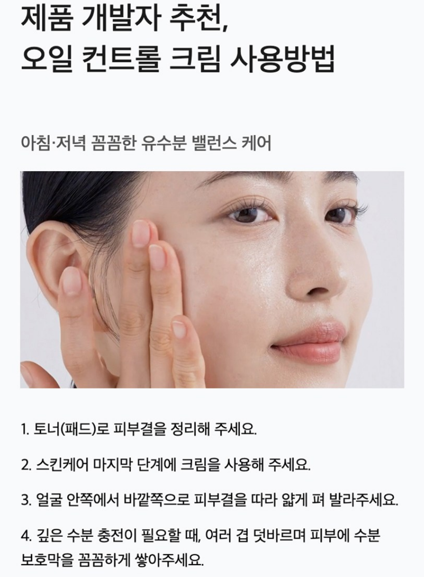 피지 분비가 활발한 T존과 나비존 모공 위주로 오일 컨트롤 에센스를 집중적으로 사용해주시고 U존은 오일 컨트롤 수분 크림으로 마무리 해주시면 좋아요. 부위별 건조함에 따라 크림을 소량씩 추가해서 사용해주시면 돼요.