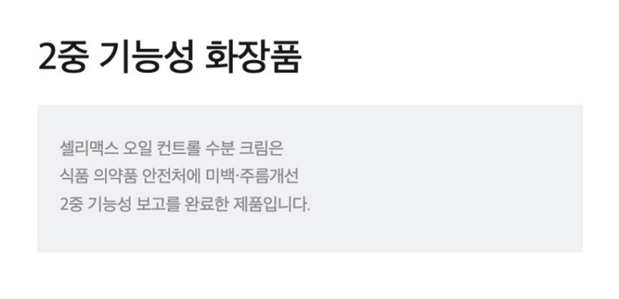 셀리맥스 오일 컨트롤 수분 크림은 식품 의약품 안전처에 미백/주름개선 2중 기능성 보고를 완료한 제품이에요.