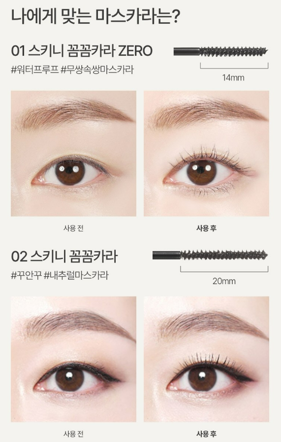 워터프루프 제품이나 무쌍 속쌍이신 분들은 스키니 꼼꼼카라 ZERO 버전을 사용해주세요. 꾸안꾸 혹은 내추럴 마스카라를 찾고 계신 분들은 스키니 꼼꼼카라를 사용해주시면 좋아요.