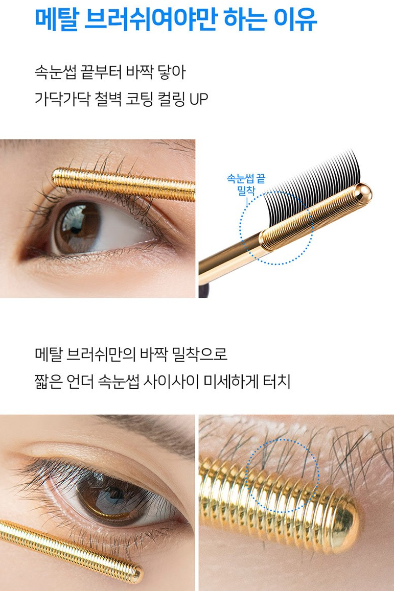 메탈 브러쉬라 위생이나 관리 면에서 편리하다는 점이 장점이에요. 또 속눈썹 가장 안쪽 혹은 언더래쉬 등 정교한 터치가 필요한 부분도 뭉침없이 마스카라를 바를 수 있어서 좋아요.