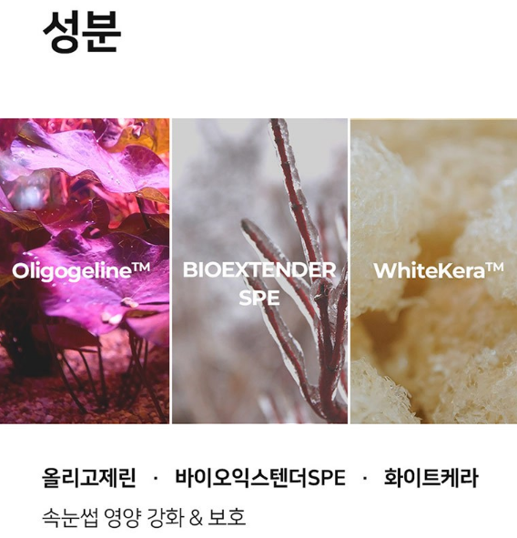 올리고제린, 바이오익스텐더SPE, 화이트케라 성분이 속눈썹 영양을 강화하고 보호해줘요.