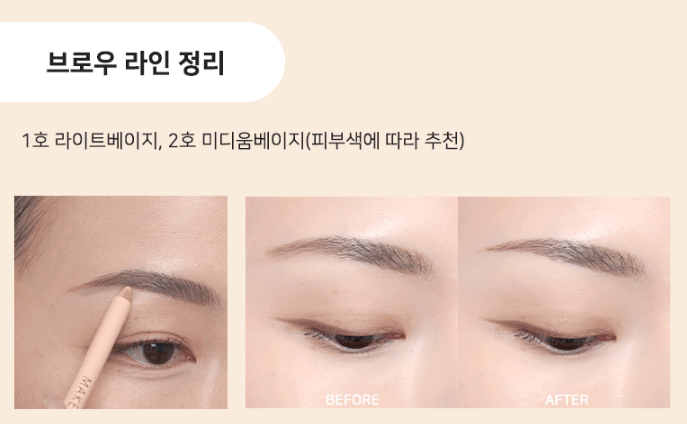 피부색에 따라 색상 골라 주시고 아이브로우가 번지거나 깔끔하지 못한 부분에 가볍게 발라 정리할 수 있어요.
