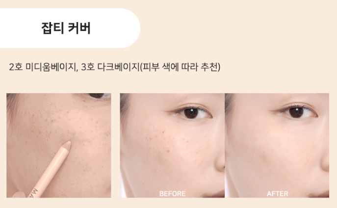 밝은 피부(17호~19호)일 경우 1호를, 중간 피부(21호)일 경우 2호, 어두운 피부(23호)일 경우 3호를 사용하시면 되고, 다크서클 커버, 애교살 연출, 눈매 뒤트임 연출은 1호, 잡티 커버, 립 라인 정리, 아이브로우 라인 정리는 2호, 잡티 및 붉은기 커버는 3호 사용하시면 될 것 같아요~