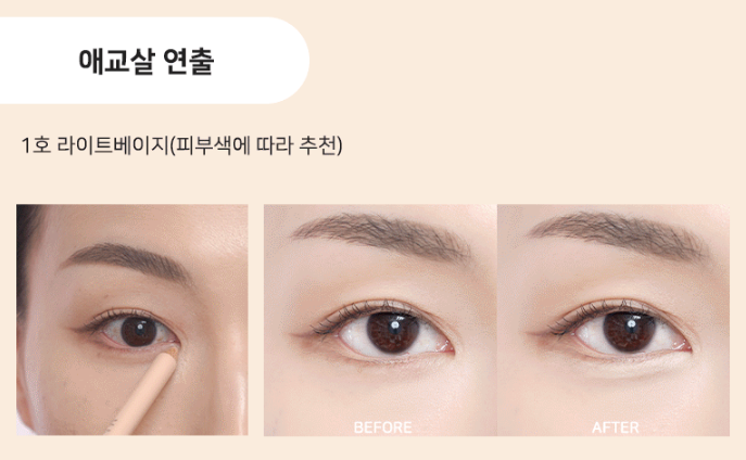 오늘 포스팅의 주제이지요! 1호 라이트 베이지 색상 추천 드리고, 눈 앞쪽 부분을 밝혀주면 애교살을 더욱 돋보이게 할 수 있어요!