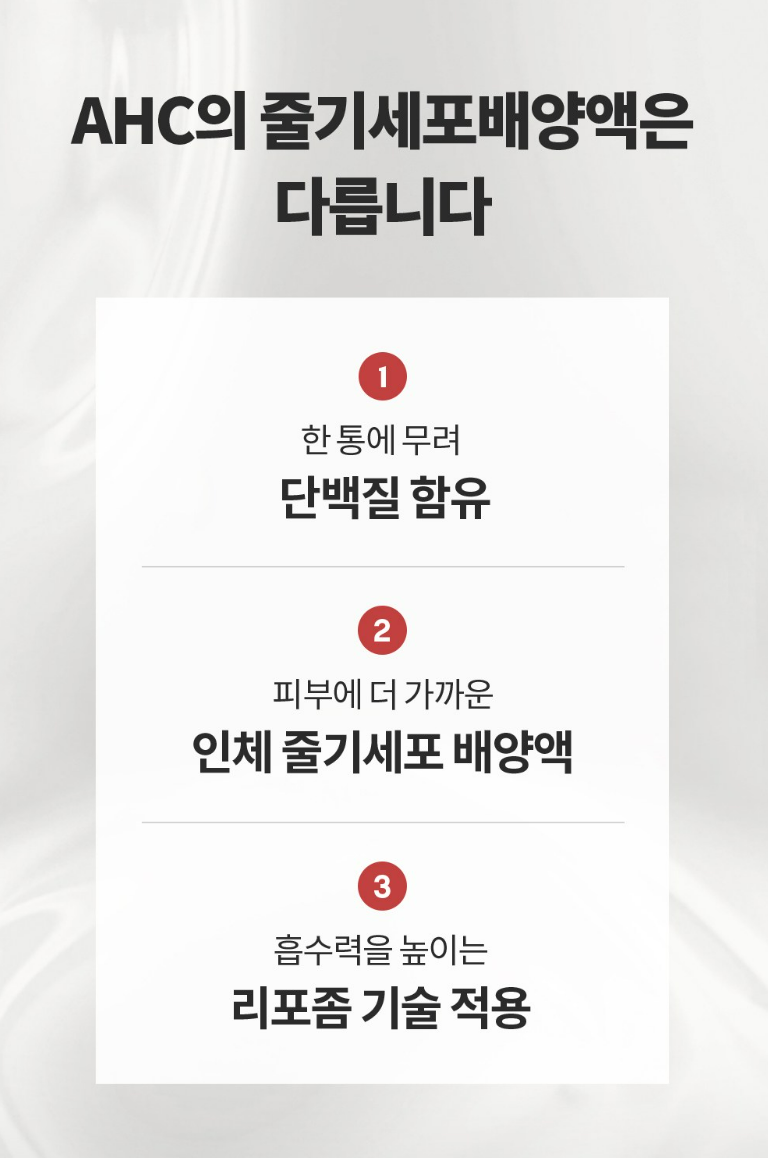 AHC 줄기 세포 배양액은 한 통에 단백질을 함유하고 있으며, 피부에 더 가까운 인체 줄기세포 배양액을 담고 있어요. 또한 흡수력을 높이는 리포좀 기술을 적용했어요.