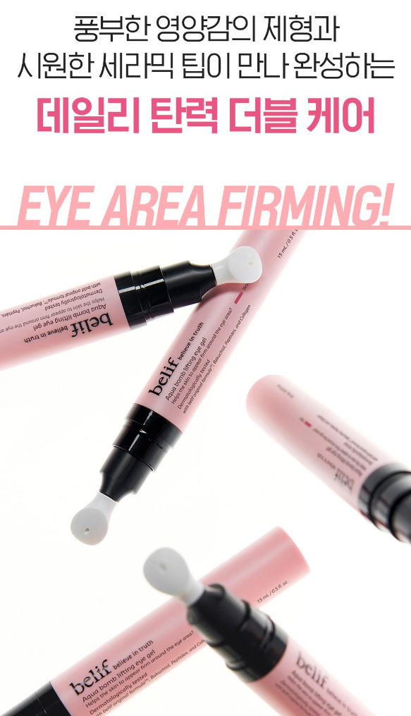 빌리프의 아쿠아 밤 리프팅 아이젤은 풍부한 영양감의 제형과 시원한 세라믹 팁이 만나 데일리 탄력 더블 케어가 가능해요.