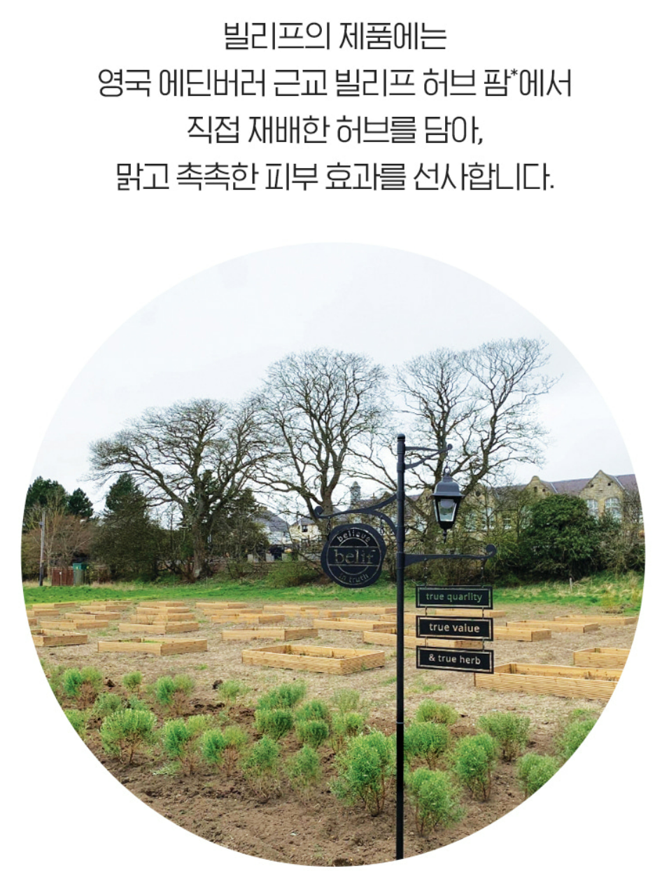 빌리프 제품에는 영국 에딘버러 근교 빌리프 허브 팜에서 직접 재배한 허브를 담아, 맑고 촉촉한 피부 효과를 선사해줘요.
