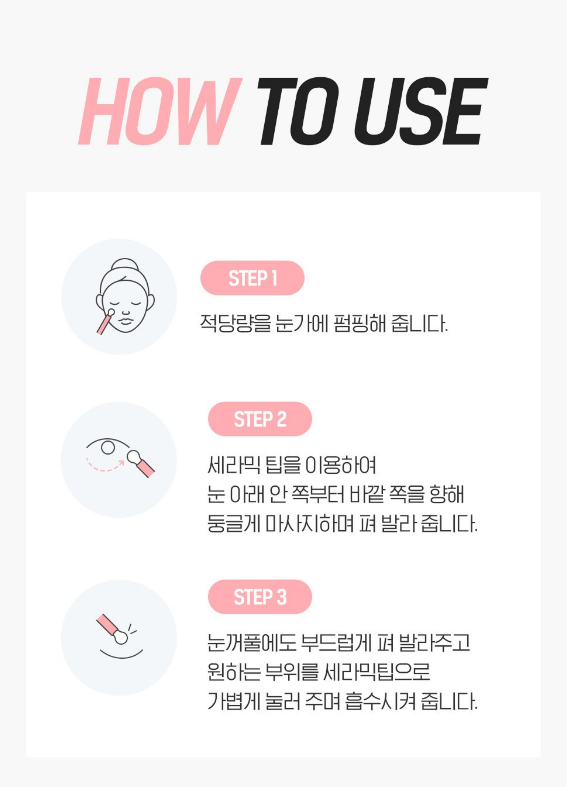 먼저 적당량을 눈가에 펌핑해주고 세라믹 팁을 이용하여 눈 아래 안쪽부터 바깥쪽을 향해 둥글게 마사지하며 펴발라 주세요.