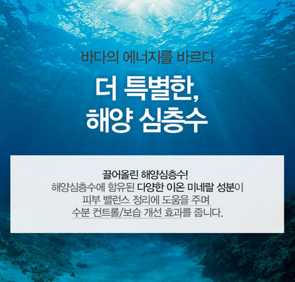 해양심층수에 함유된 70여종의 다양한 미네랄 성분이 피부 밸런스 정리에 도움을 주며 수분 컨트롤 효과를 줘요.