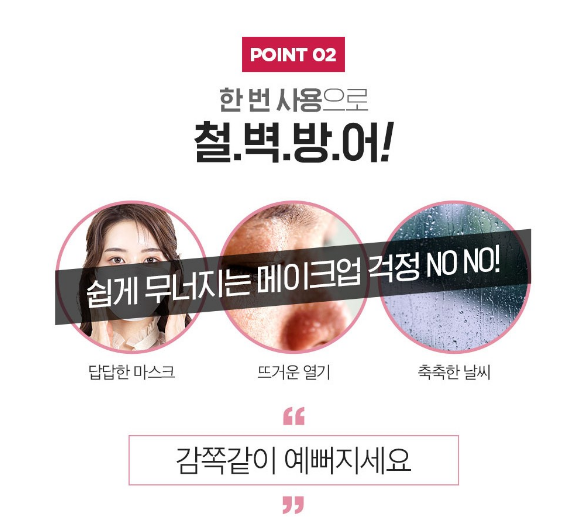 쉽게 무너지는 메이크업도 걱정하지 않으셔도 돼요. 피부에 매끈하게 착 붙는 쫀쫀한 밀착감으로 오랫동안 피부 상태를 유지할 수 있어요.