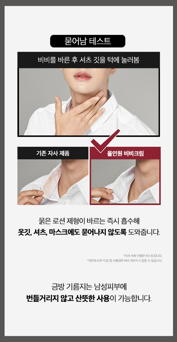 무겁게 바르지 않고 한 겹만으로도 피부 커버가 된다는 점이 큰 장점이에요. 또한 유분감이나 끈적임이 심하지 않아 남성분들이 데일리로 사용하기에 좋아요.