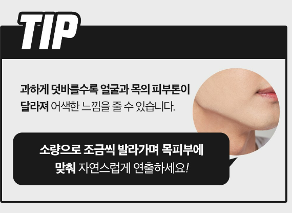 과하게 덧바를수록 얼굴과 목의 피부톤이 달라져 어색한 느낌을 줄 수 있으니 소량으로 조금씩 발라가며 목 피부에 맞춰 자연스럽게 연출해주세요.