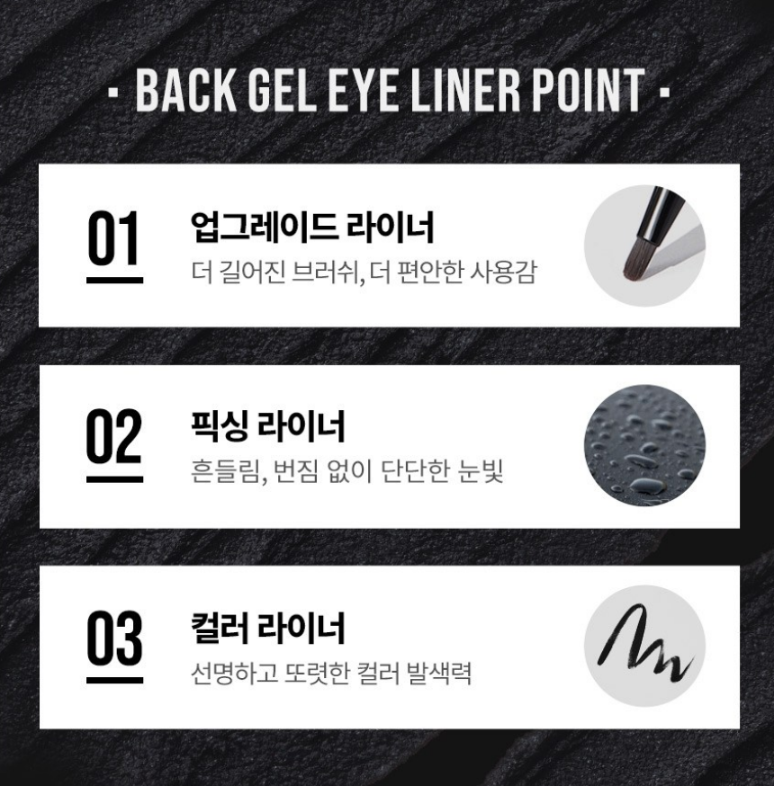 롱 래스팅 젤 포뮬라가 매끄럽게 밀착되어 흔들림 없이 아이라인을 고정할 수 있고, 부드럽고 소프트한 드로잉이 가능해요.