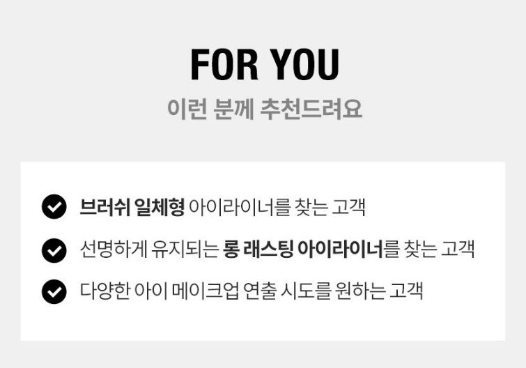브러쉬 일체형 아이라이너를 찾는 분, 선명하게 유지되는 롱 래스팅 아이라이너를 찾는 분, 다양한 아이 메이크업 연출 시도를 원하는 분들께 추천드려요.