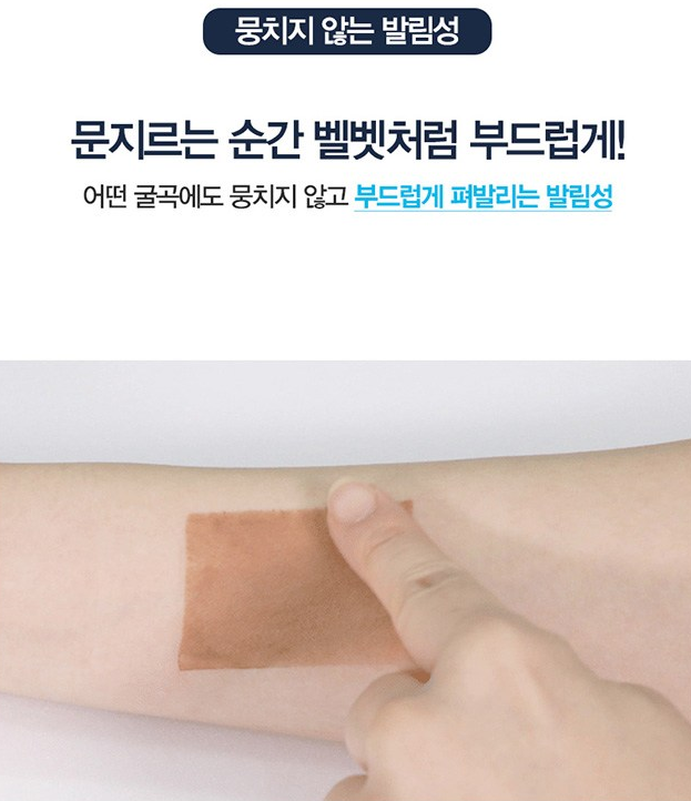 어떤 굴곡에도 미끄러지듯 부드럽게 발리는 게 특징으로, 들뜸없이 완벽하게 밀착된답니다.