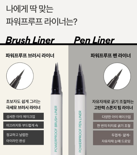 파워프루프 브러시 라이너와 파워프루프 펜 라이너 둘 중 나에게 맞는 제품을 선택해보세요! 펜 라이너 초보이신 분들은 부드럽게 그려지는 파워프루프 브러시 아이라이너를 추천드려요.