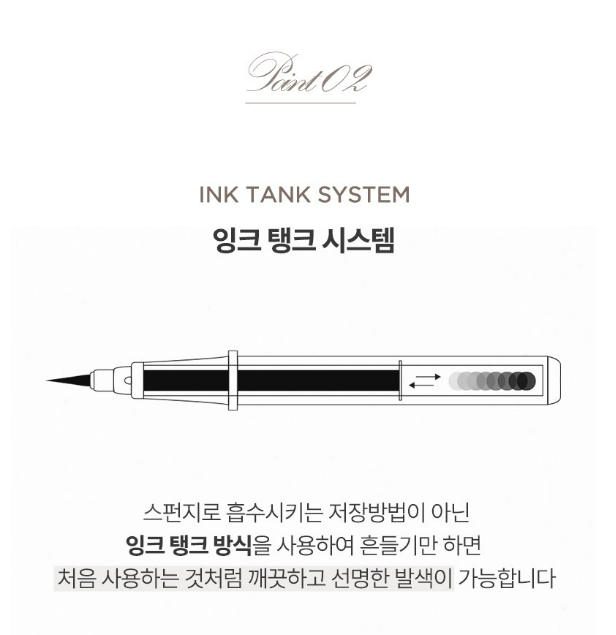 스펀지로 흡수시키는 저장 방법이 아닌 잉크 탱크 방식을 사용하여 흔들기만 하면 처음 사용하는 것처럼 깨끗하고 선명한 발색이 가능해요.