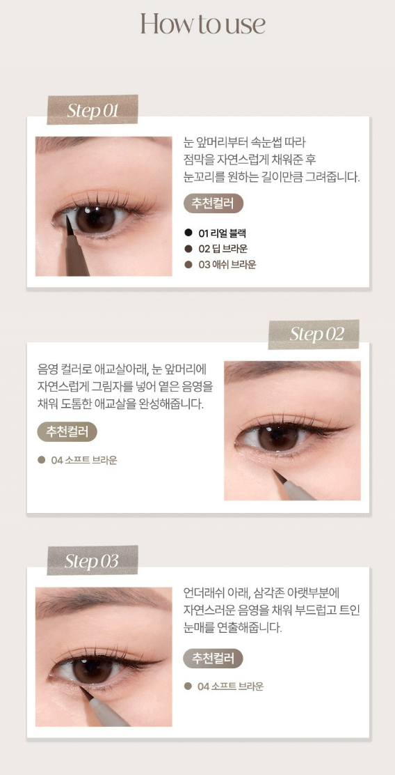눈 앞머리부터 속눈썹을 따라 점막을 자연스럽게 채워준 후 눈꼬리를 원하는 길이만큼 그려주세요. 음영 컬러로 애교사 아래, 눈 앞머리에 자연스럽게 그림자를 넣어 옅은 음영을 채워 도톰한 애교살을 완성해줘요. 언더 래쉬 아래, 삼각존 아랫부분에 자연스러운 음영을 채워 부드럽고 트인 눈매를 연출해줘요.
