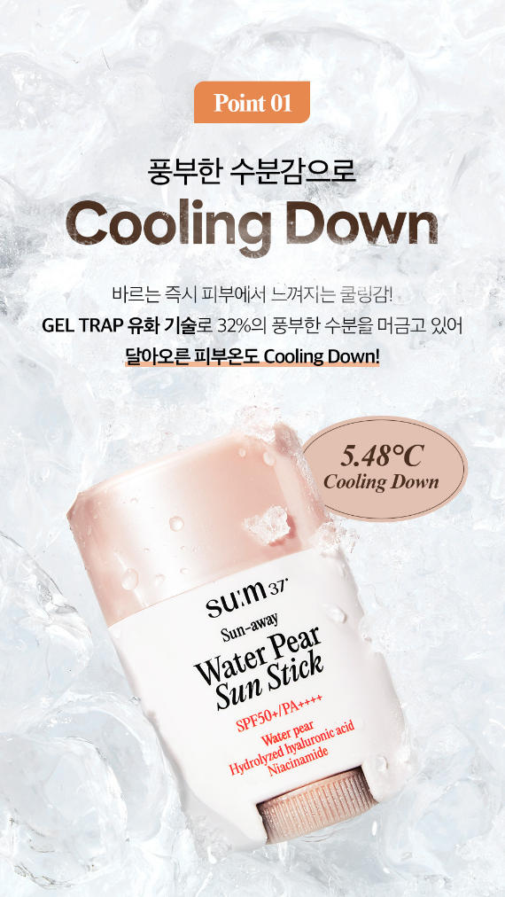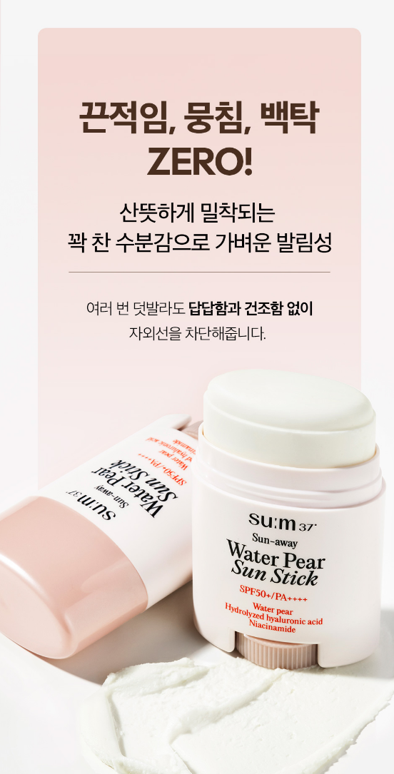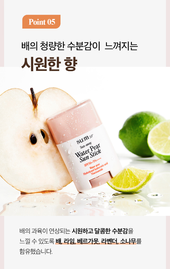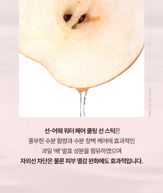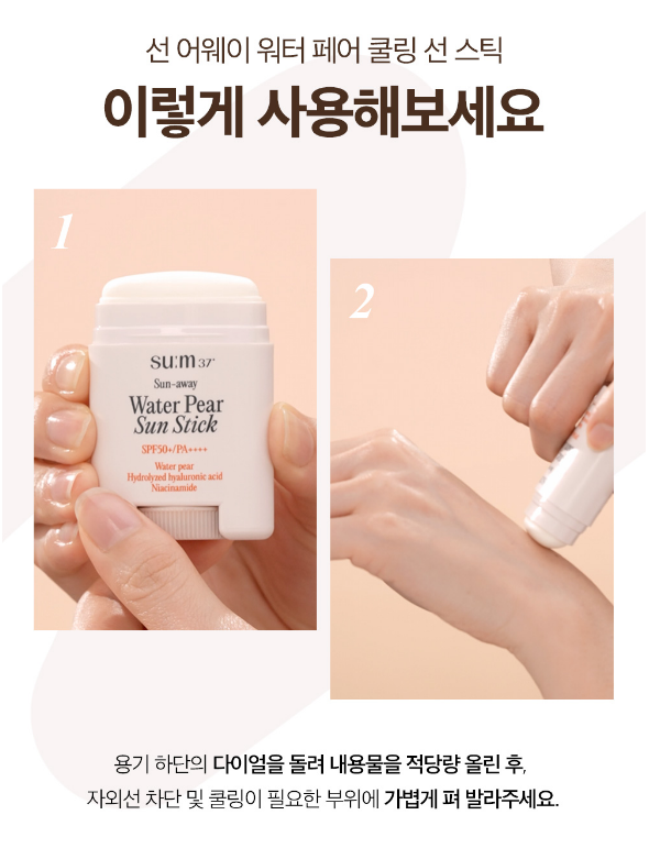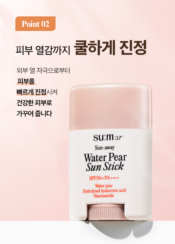 숨37도 선-어웨 워터 페어 쿨링 선스틱은 풍부한 수분 함량과 수분 장벽 케어에 효과적인 과일 배 발효 성분을 함유하였으며 자외선 차단은 물론 피부 열감 완화에도 효과적이에요.