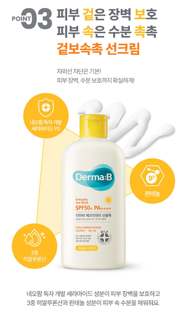 바디 선크림 찾고 계셨나요? 얼굴뿐만 아니라 팔, 다리까지 부담 없이 듬뿍 바를 수 있는 제품을 찾는다면 더마비 에브리데이 선블록을 주목해보세요. 200ml 대용량으로 온 가족이 함께 쓰기 좋고, 끈적임 없이 산뜻 촉촉하게 마무리되는 바디 선크림이에요.