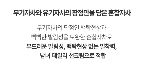 무기자차의 단점인 백탁현상과 뻑뻑한 발림성을 보완한 혼합자차로 부드러운 발림성, 백탁현상 없는 밀착력, 남녀 데일리 선크림으로 적합해요.