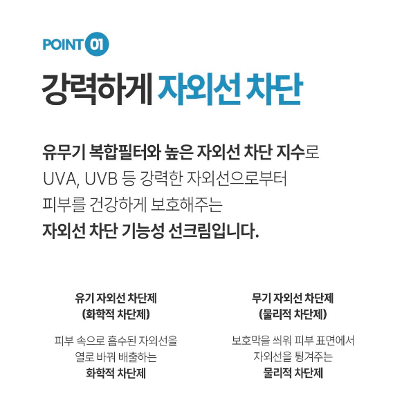 유무기 복합 필터와 높은 자외선 차단 지수로 UVA, UVB 등 강력한 자외선으로부터 피부를 건강하게 보호해주는 자외선 차단 기능성 선크림이에요.