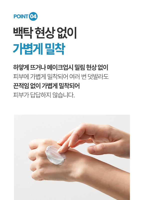 하얗게 뜨거나 메이크업시 밀림 현상 없이 피부에 가볍게 밀착되어 여러 번 덧발라도 끈적임 없이 가볍게 밀착되어 피부가 답답하지 않아요.